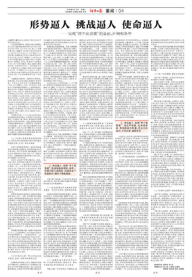 第一篇《谱写新时代中原更加出彩新篇章——“两个高质量”的时代价值与实践意义》,已于8月17日刊出;第二篇《形势逼人 挑战逼人 使命逼人——实现“两个高质量”的基础、环境和条件》于今日在河南日报头版转四版推出,现将文章全文刊发如下,以飨读者。