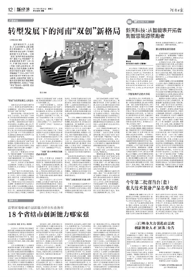 “双创”服务平台得到新发展。随着郑洛新国家自主创新示范区设立,平顶山、焦作正式获批为国家高新区,截至目前,全省国家高新区的总数达到了7个,数量位居中西部之首。中原现代农业科技示范区成为全国第一批国家级现代农业科技示范区,新增4个企业国家重点实验室,这是全省自2010年以来获批数量最多的一年。国务院批准郑州航空港经济综合实验区、中信重工机械股份有限公司为全国首批“双创”示范基地,河南省获批数量与上海、江苏、浙江并列全国第二位。