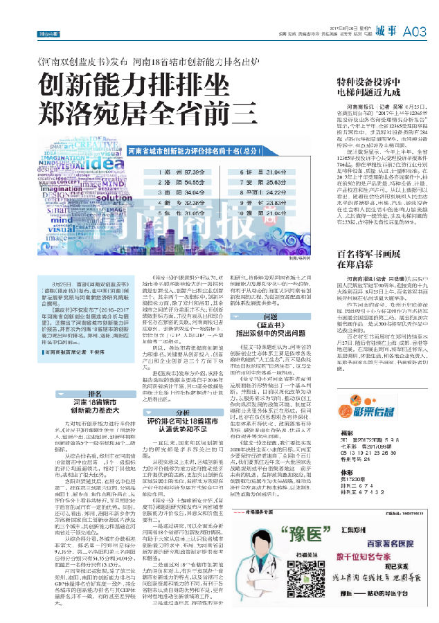 《蓝皮书》不仅发布了《2016~2017年河南省创新创业发展走势分析与展望》,还推出了河南省城市创新能力评价报告,并首次为河南18省辖市的创新能力做出评价排名。郑州、洛阳、南阳在排名中位列前三。