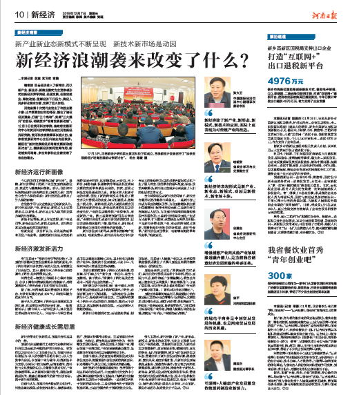 为推动新经济研究,助力新经济发展,2016年12月3日,河南新经济研究院签约揭牌仪式暨加快发展新经济培育发展新动能研讨会在黄河科技学院隆重举行。12月7日,河南日报新经济版刊登报道,以《新产业新业态新模式不断呈现 新技术新市场是动因 新经济浪潮袭来改变了什么? 》为题,对此次活动进行了报道。