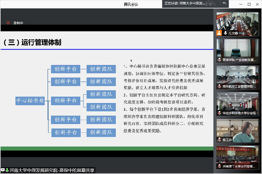 河南大学教授高保中做了题为“聚焦省委省政府重大战略部署 建设高水平智库平台”的发言。他围绕体制机制创新、团队建设、科学研究、社会服务等内容详细介绍了中原发展研究院在智库建设方面取得的成绩,谈了建设高水平智库平台的思考与建议。