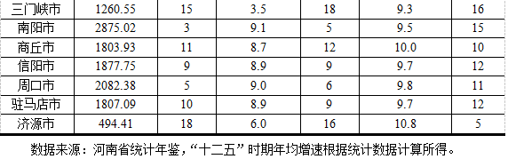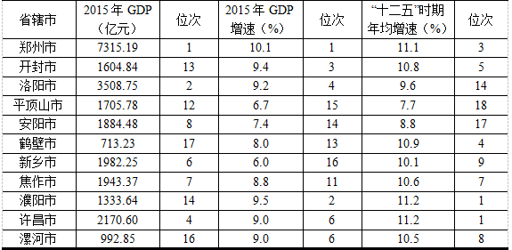 表1 河南各省辖市“十二五”经济增长情况及排序情况