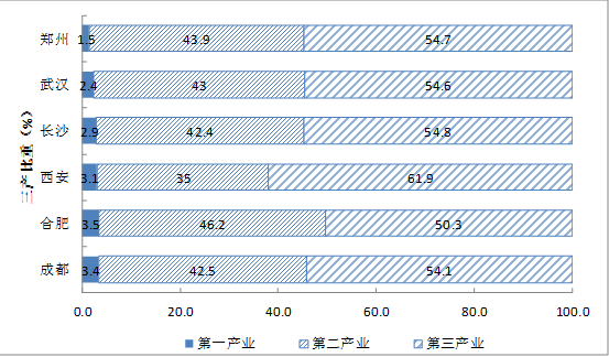 图3 中部六个省会城市2018年三产比重对比