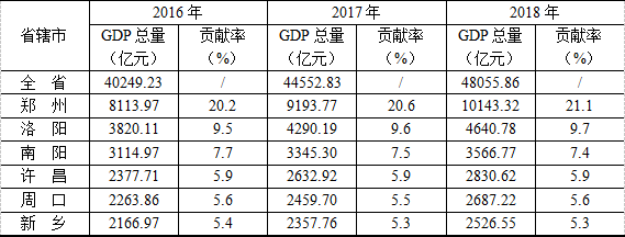 表2 2016年~2018年主要省辖市GDP总量及对河南省GDP贡献率
