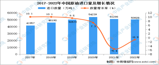 中国原油对外依存度。据中商产业研究院数据库显示,2022年,中国原油产量2.05亿吨,原油进口量达到5.08亿吨,石油进口依赖度高达71.2%。